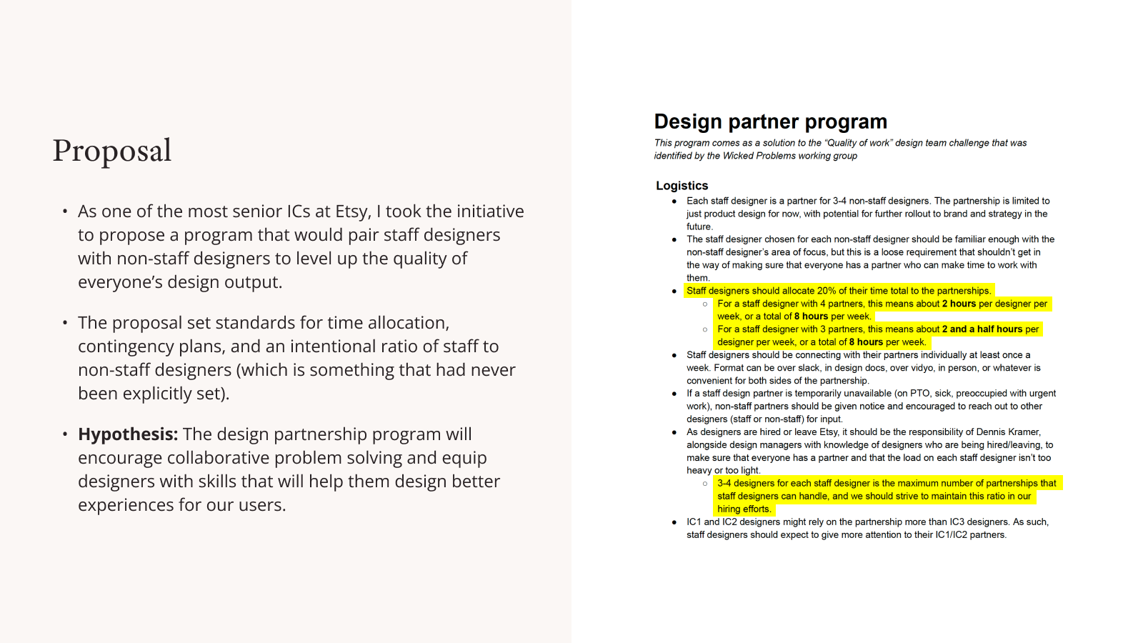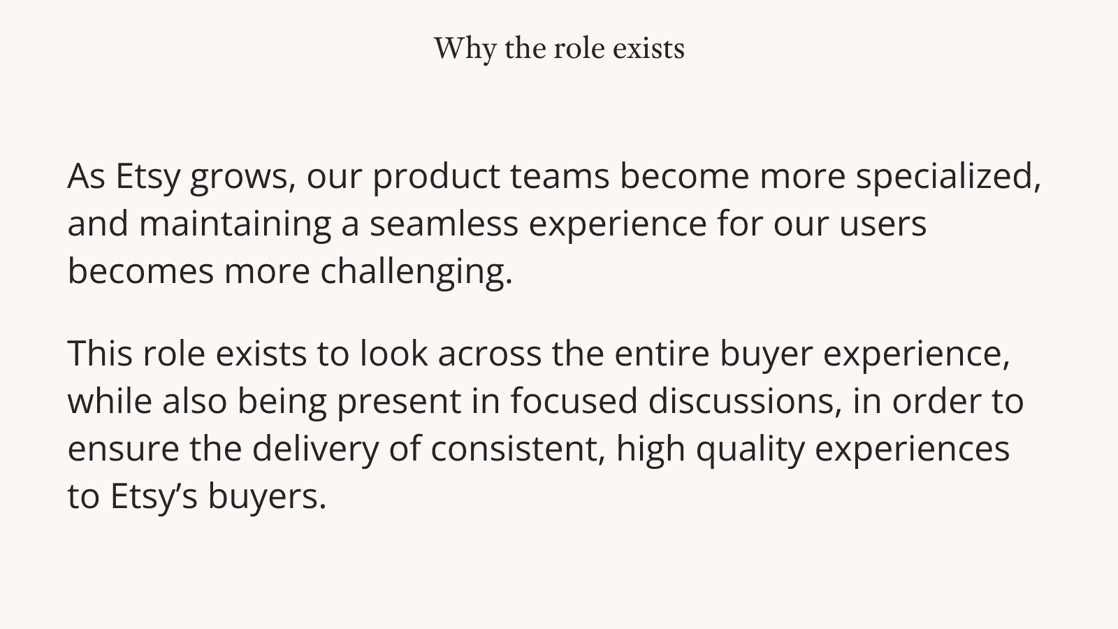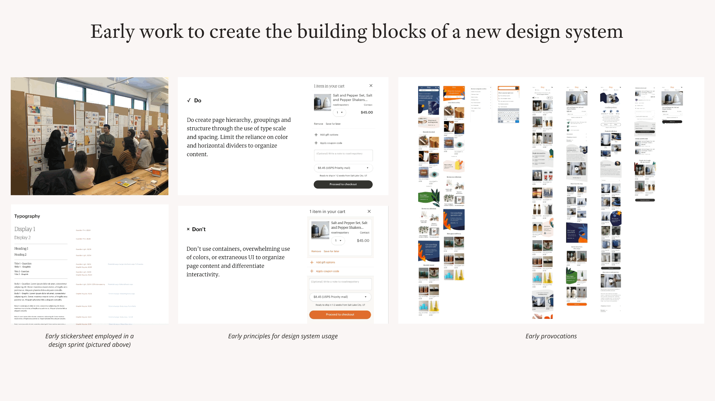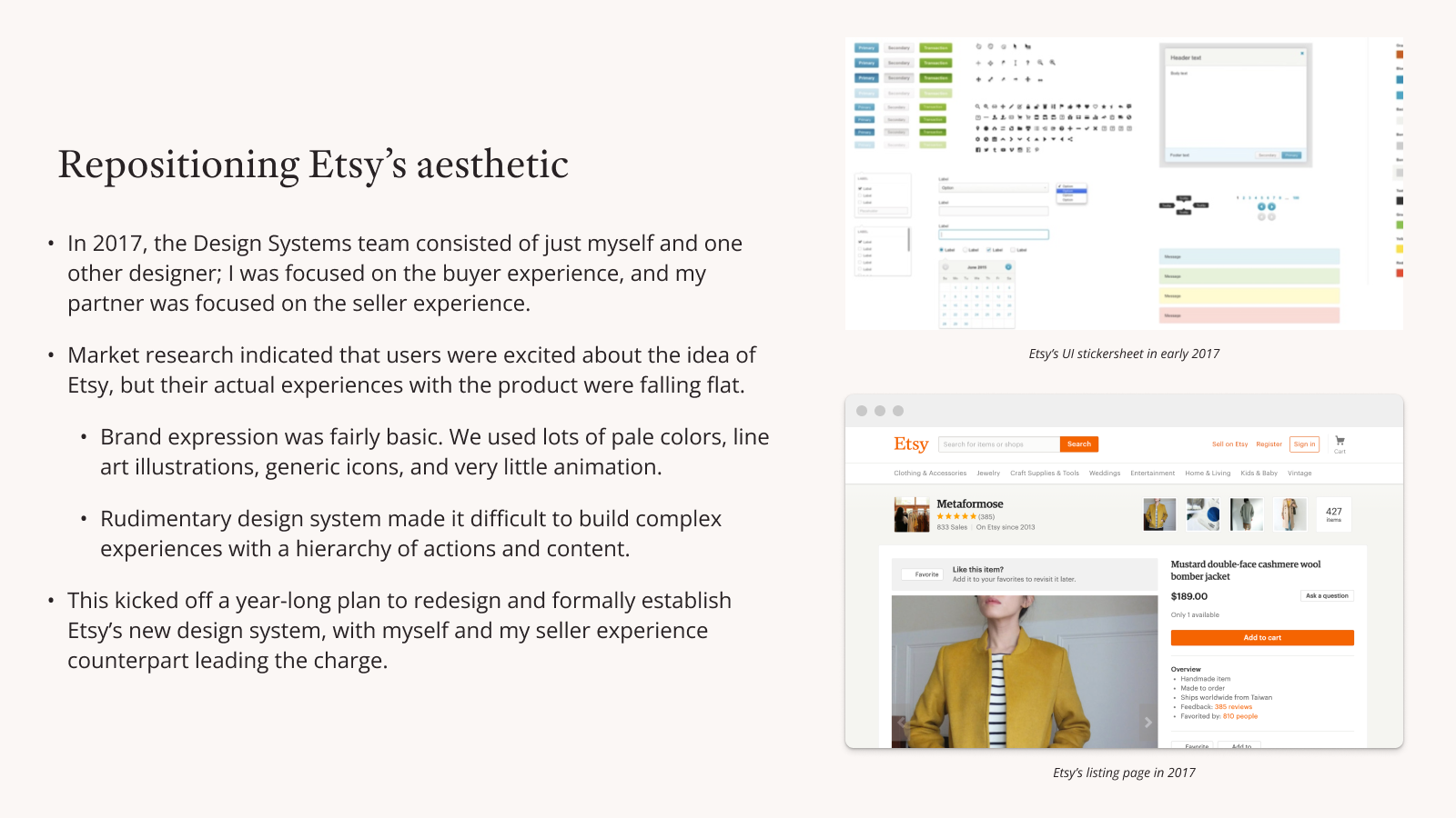 Etsy has a long history of product squad autonomy, where each individual designer (along with their PM and engineering partners) is the primary decider of what is or isn't good enough for their team to ship. While this was great for empowering individuals, it resulted in a mixed bag of user experience quality and consistency.