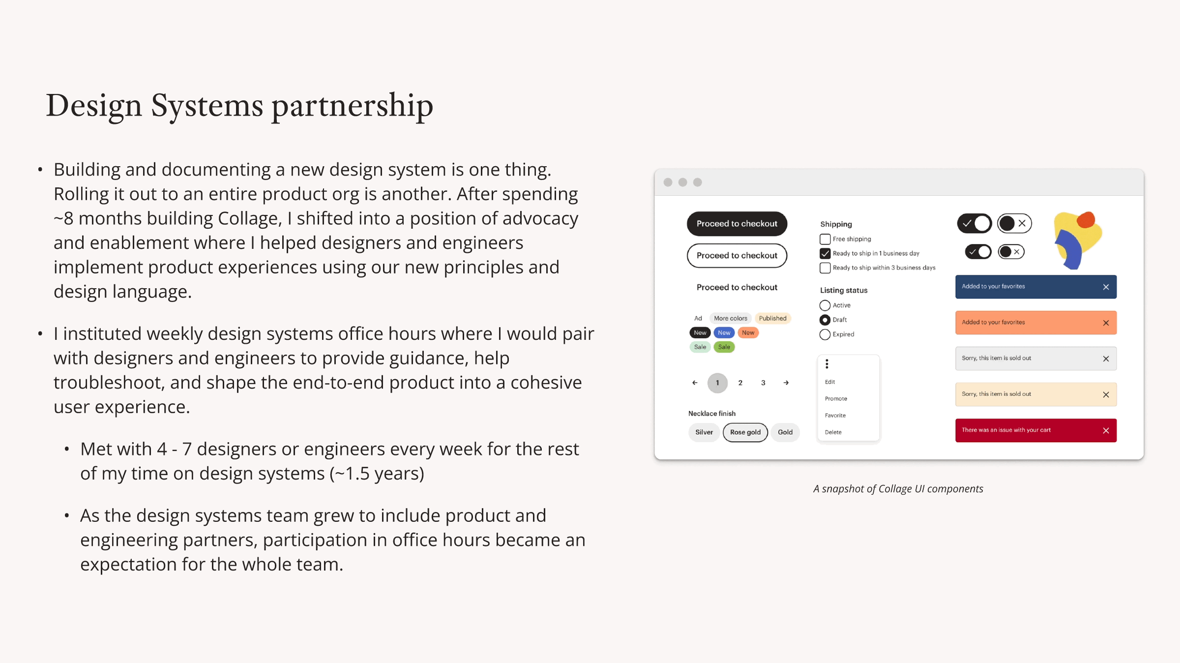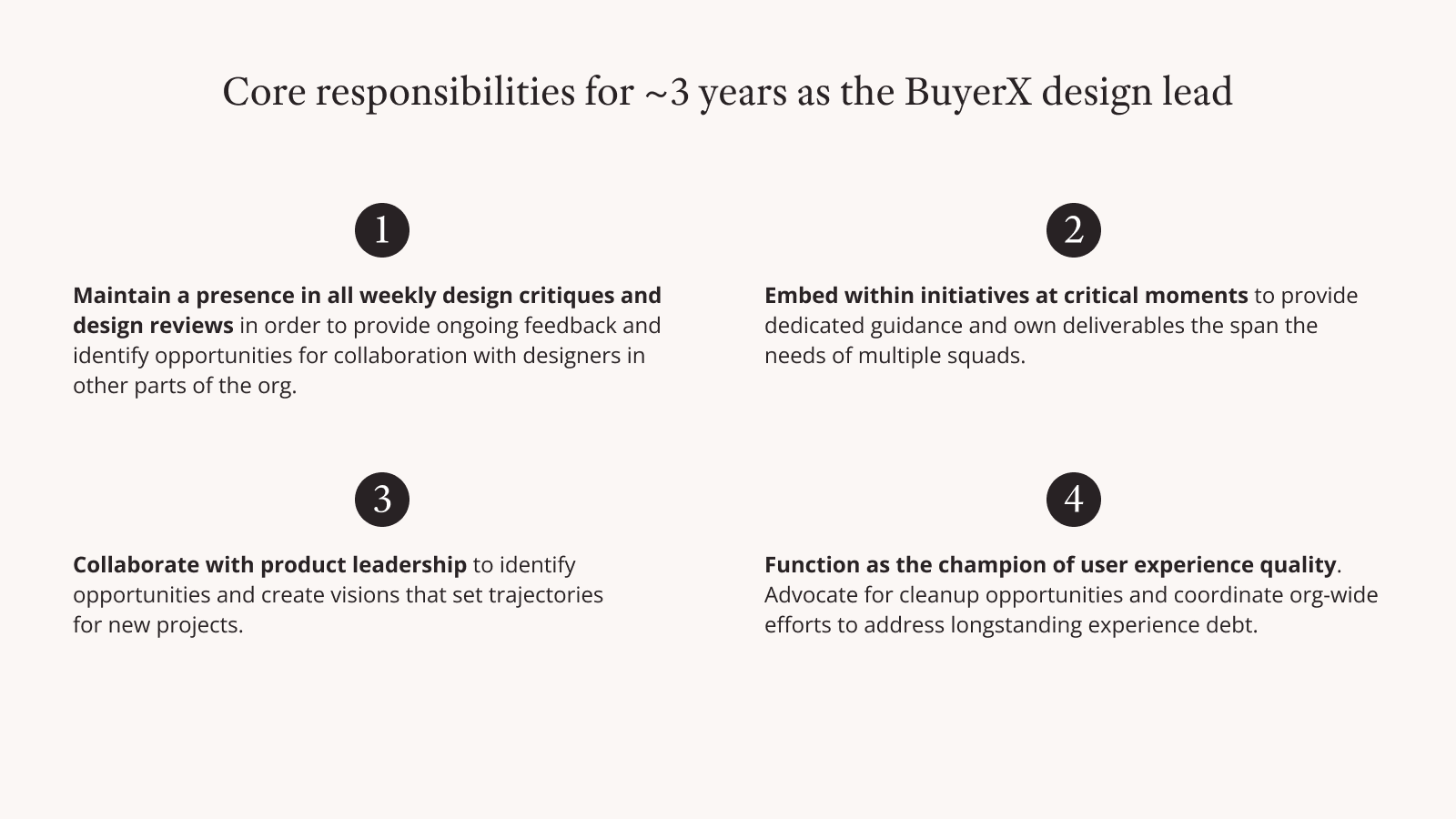 What started as a passion project that I'd pick up or put down as time allowed morphed into a core deliverable of mine, first as the Design Lead on Design Systems (2017 - 2020), and then as the Design Lead on the Buyer Experience (2021 - 2024).