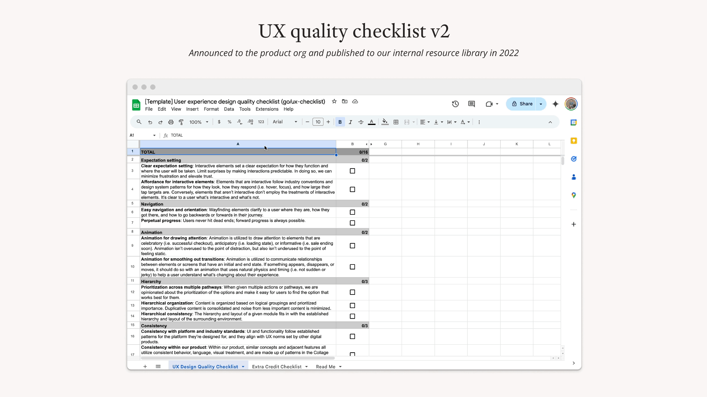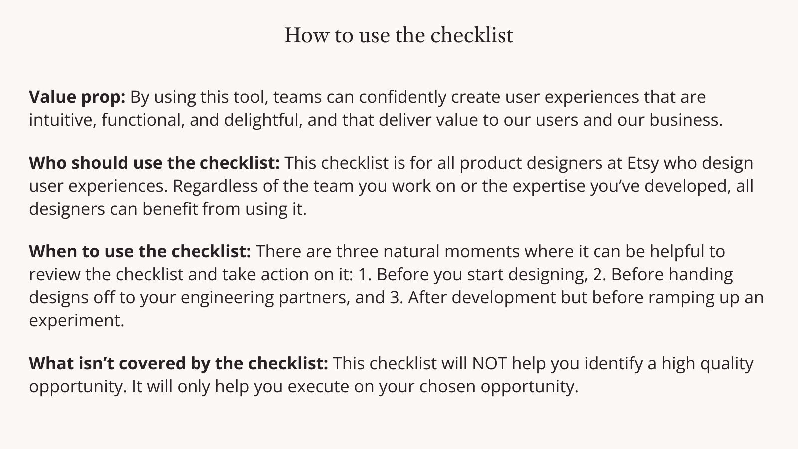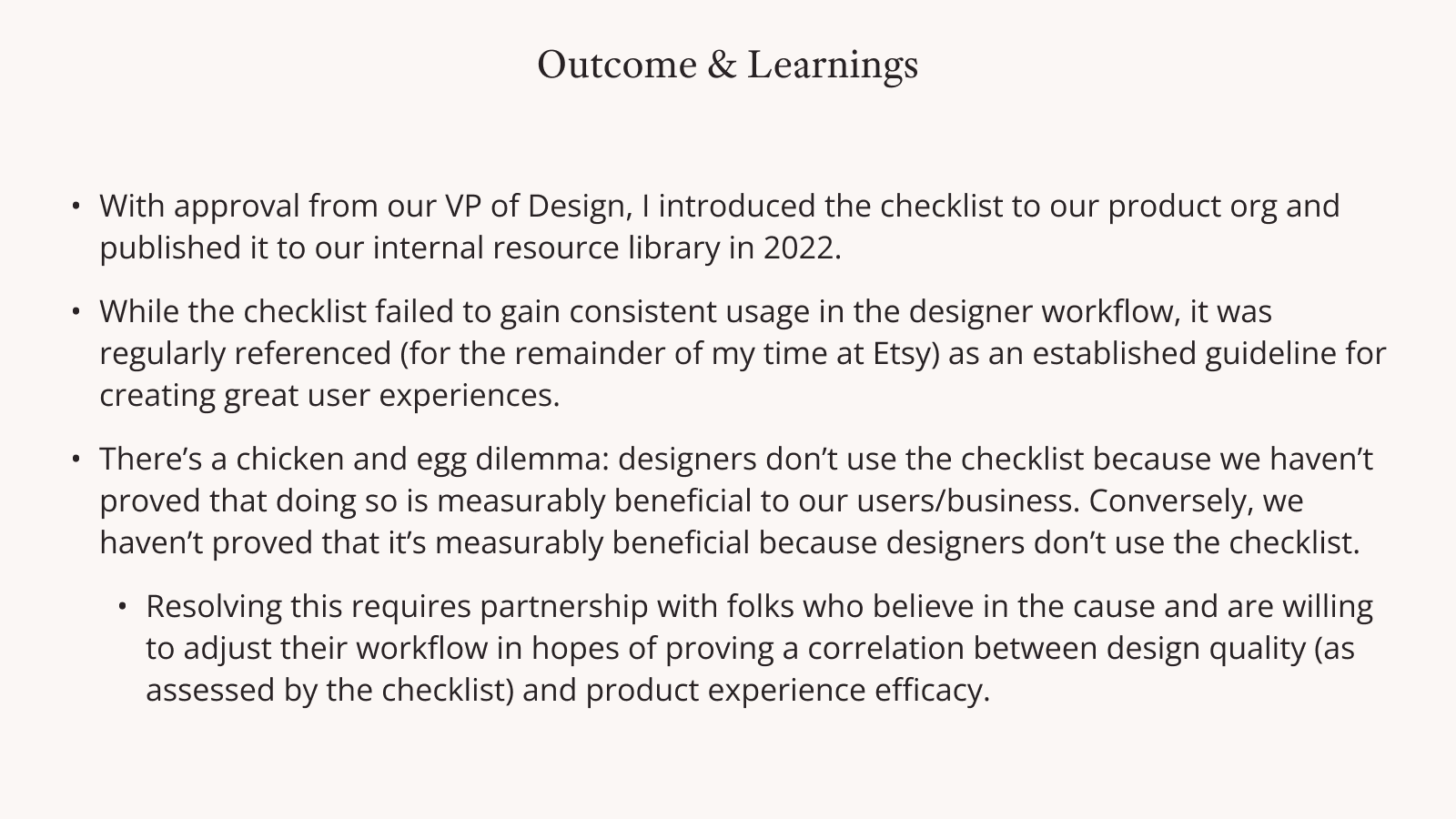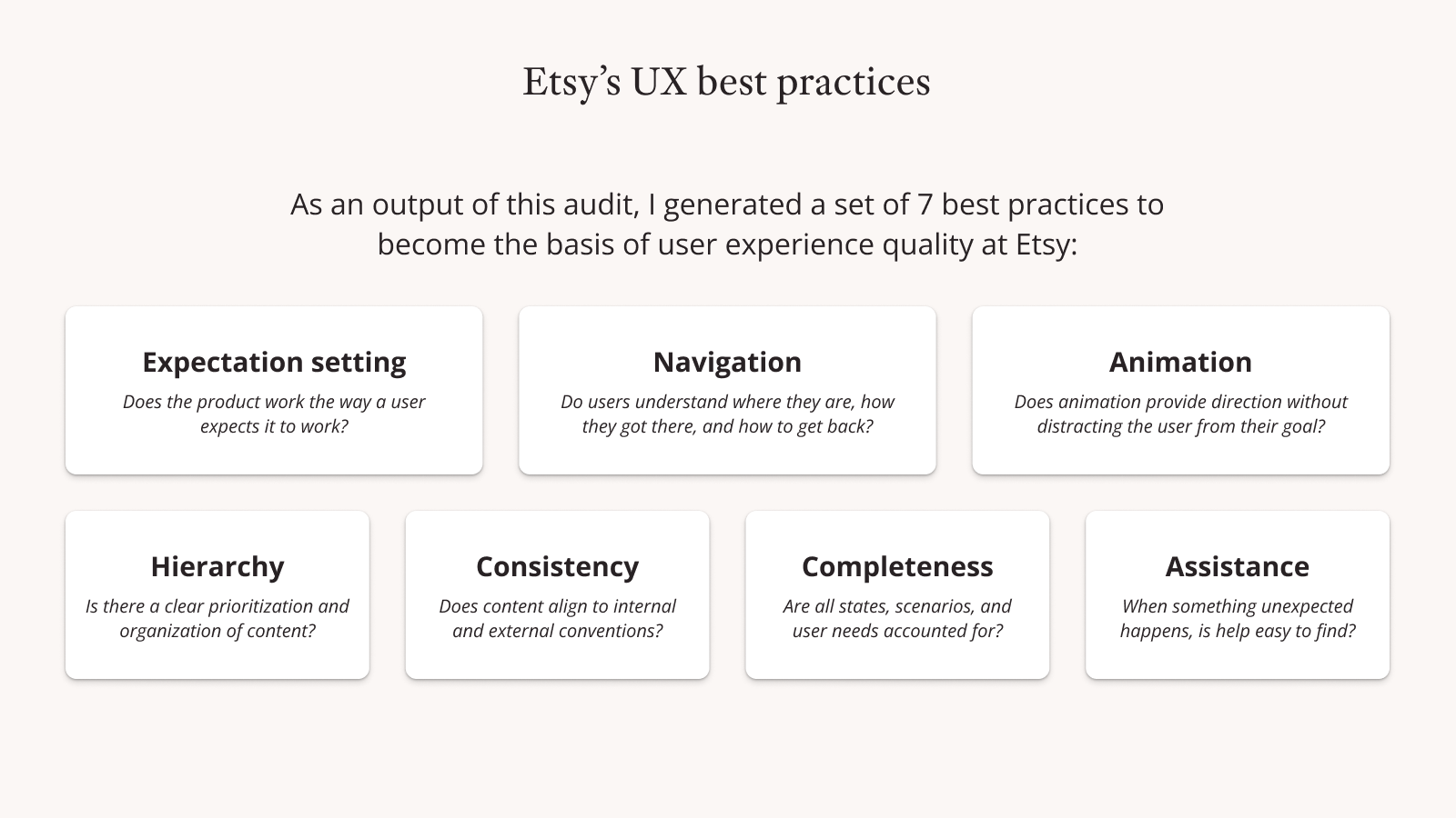In 2018, I became invested in operationalizing design quality in pursuit of standardizing our UX quality benchmark and leveling up the polish and efficacy of user experiences at Etsy.