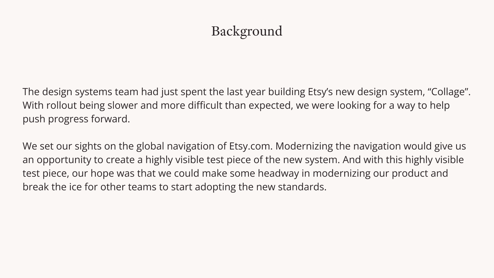 The design systems team had just spent the last year building Etsy's new design system, "Collage". With rollout being slower and more difficult than expected, we were looking for a way to help push progress forward.