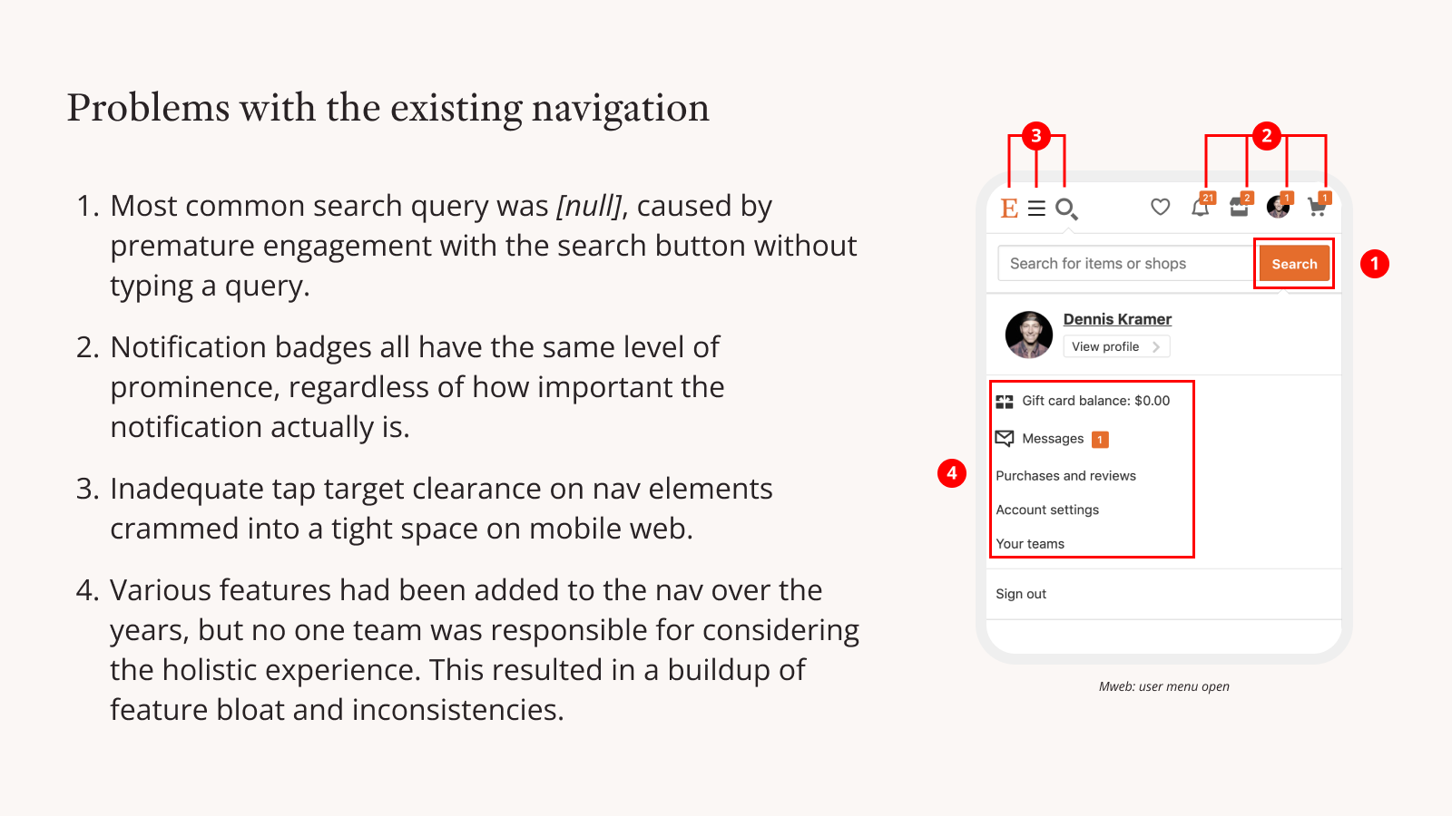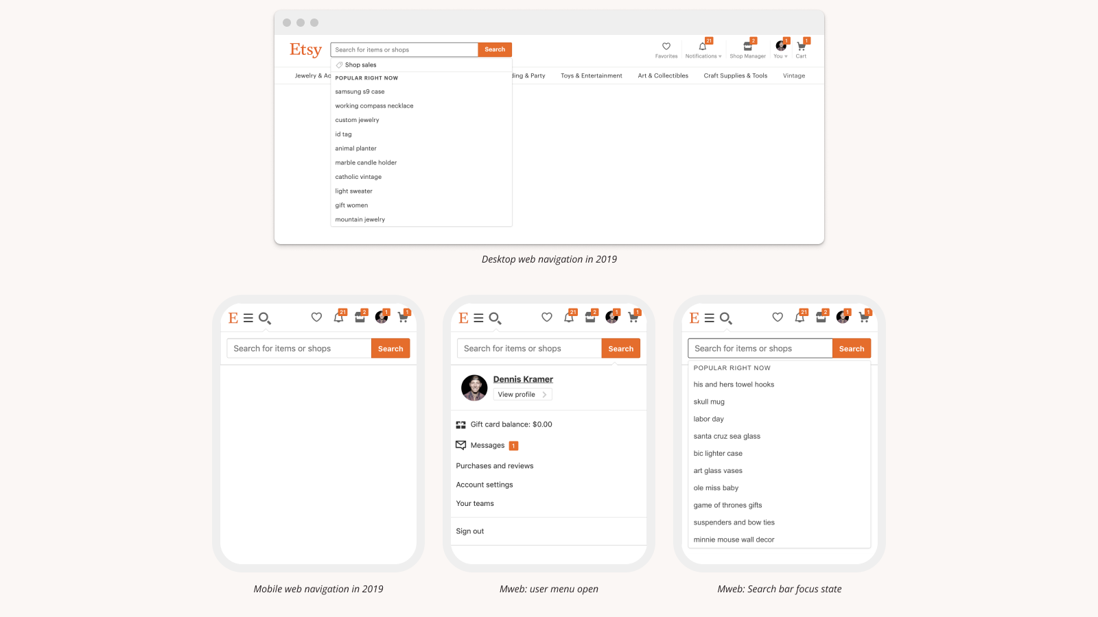We set our sights on the global navigation of Etsy.com. Modernizing the navigation would give us an opportunity to create a highly visible test piece of the new system. And with this highly visible test piece, our hope was that we could make some headway in modernizing our product and break the ice for other teams to start adopting the new standards.