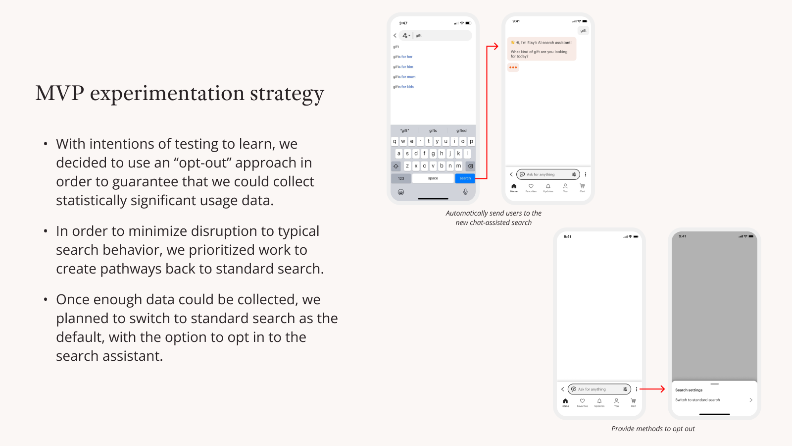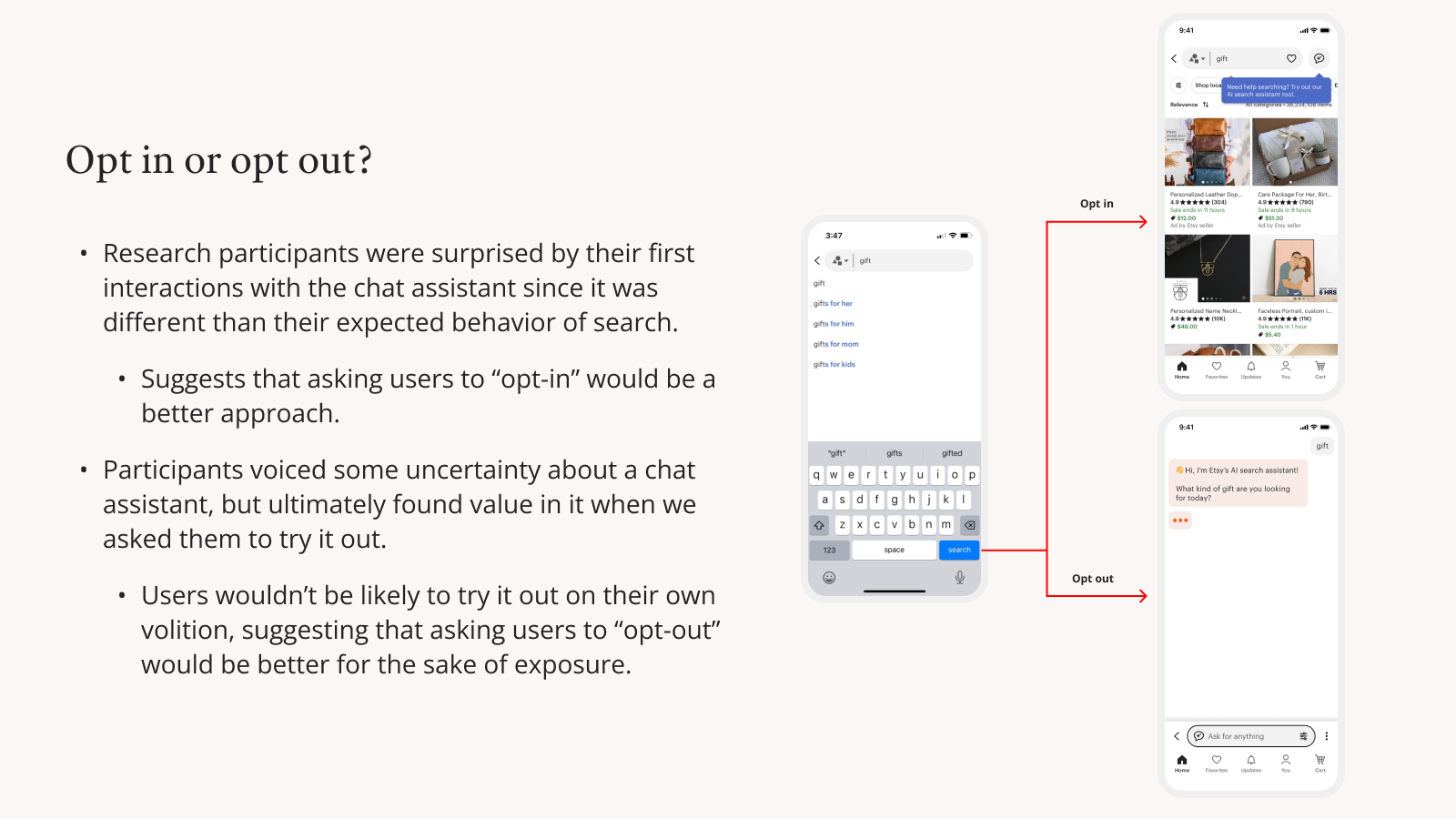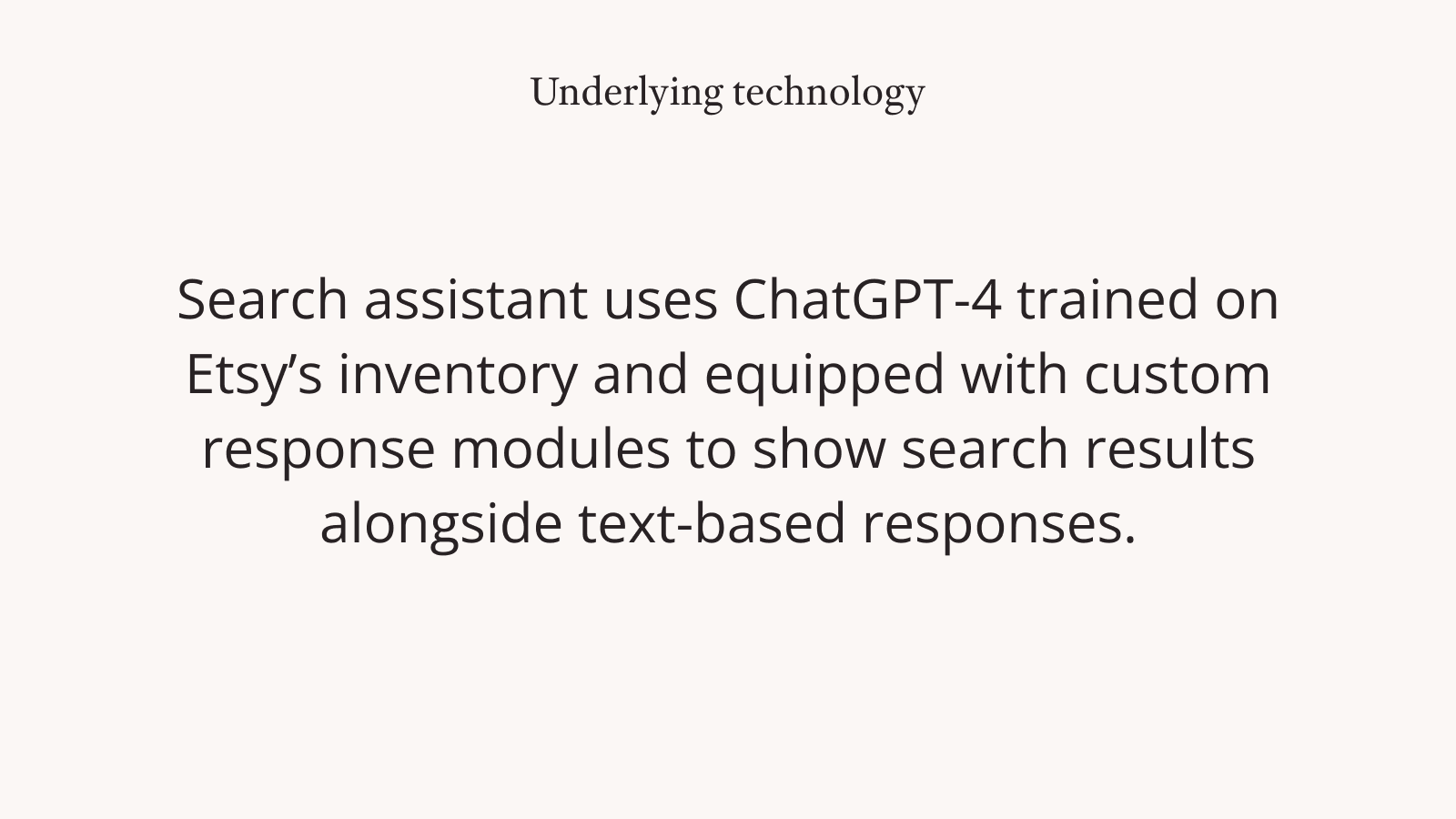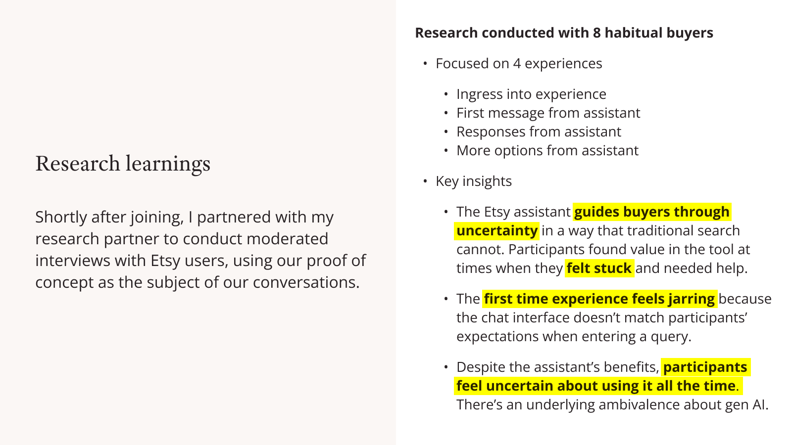 In 2023, influential e-commerce players like Amazon and Shopify began introducing chat-based AI assistants into their search experiences, and Etsy was interested in doing the same. I spent a 2 month rotation with the GenAI team to design the MVP of Etsy's AI search assistant.