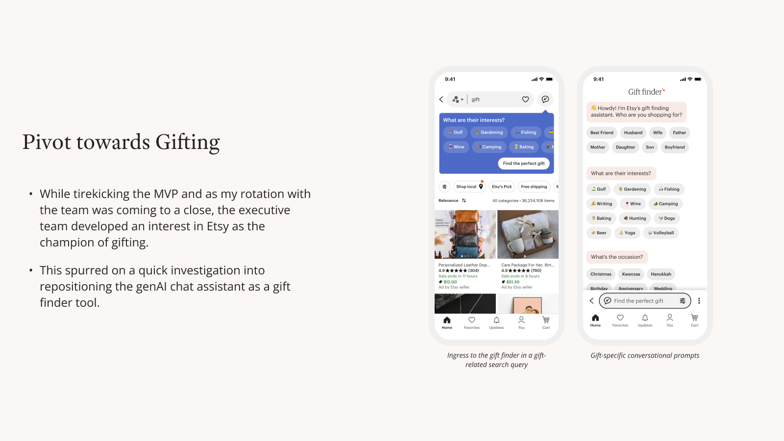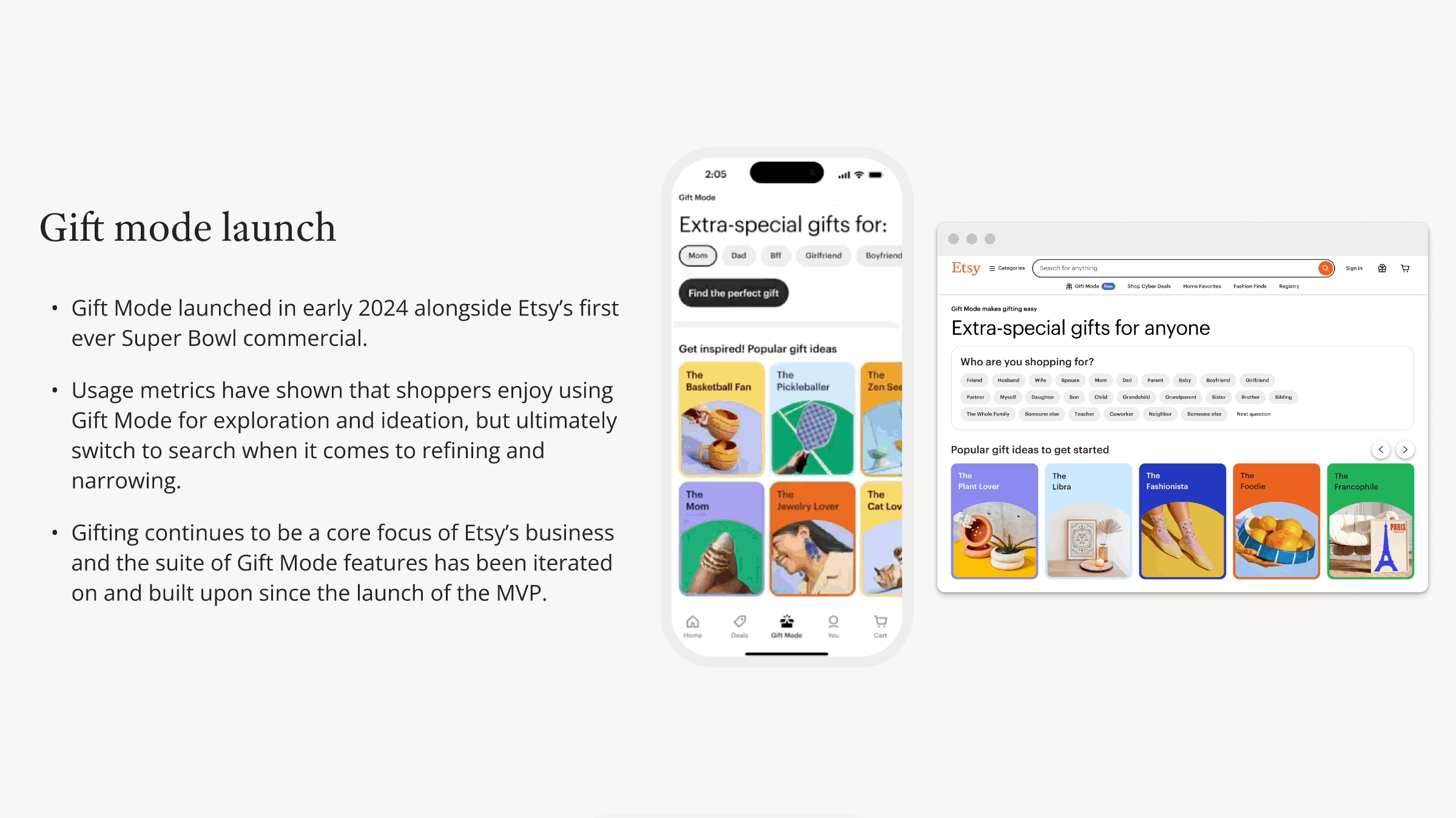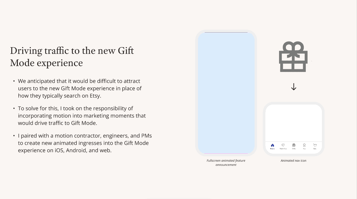 Nearing completion of the MVP, leadership developed an interest in Etsy as the champion of gifting. As a result, I then pivoted to a 6 month rotation with the newly created gifting initiative to help launch Gift Mode.